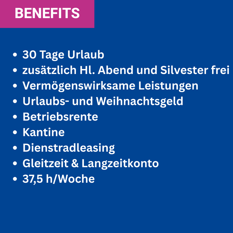 - Attraktive, leistungsgerechte Vergütung mit zusätzlichen Sonderleistungen